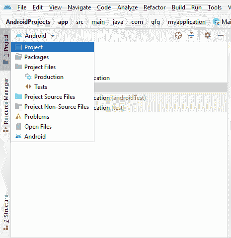 3。项目结构:这个区域允许我们浏览项目的每个文件。有各种不同的结构视图。安卓是项目结构层次的总结视图,项目是项目层次的详细视图。请看下图。
