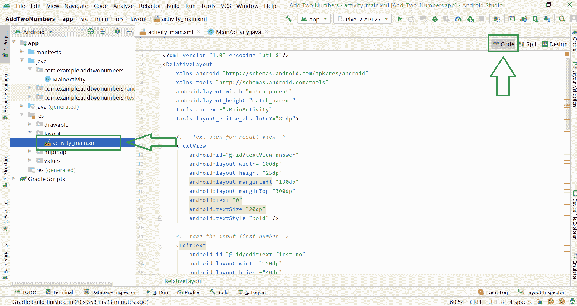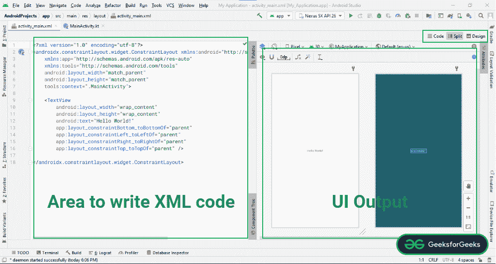 应用程序的所有用户界面布局都可以在 res/layout 目录下找到。这些是。xml 扩展,负责为应用程序构建 UIs。安卓工作室为应用程序提供了两种设计用户界面的方式。一个是文本,需要通过硬编码设计 UI,一个是设计部分,为构建 UI 提供了便捷的拖拽机制。请看下面的图片,它显示了代码是如何编写的,它继续在右窗格中显示结果。