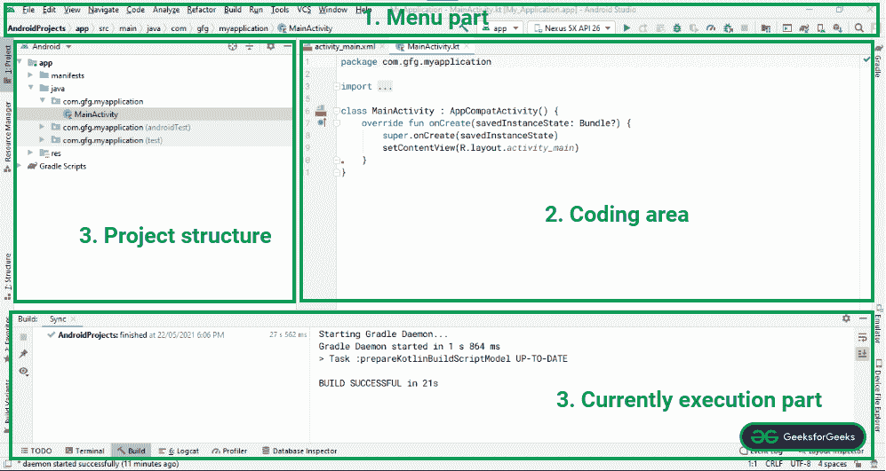 1。菜单部分:在本部分中,它提供了创建新项目、打开现有安卓工作室项目、运行应用程序的按钮、选择运行和测试应用程序所需设备的下拉菜单等选项。