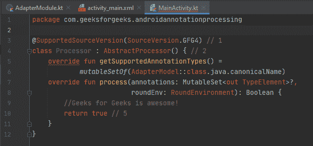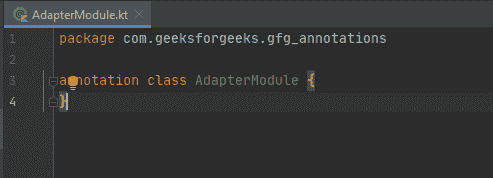 注意: AdapterModule 现在是一个常规的 Kotlin 类,但是将其转换为注释类很简单。只需将注释关键字放在类的前面。比如: