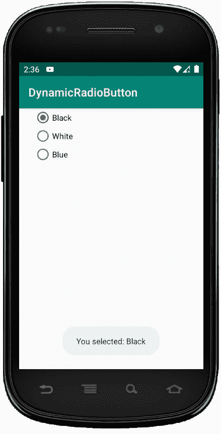 然后,使用代码将它们使用到 RadioGroup 中: