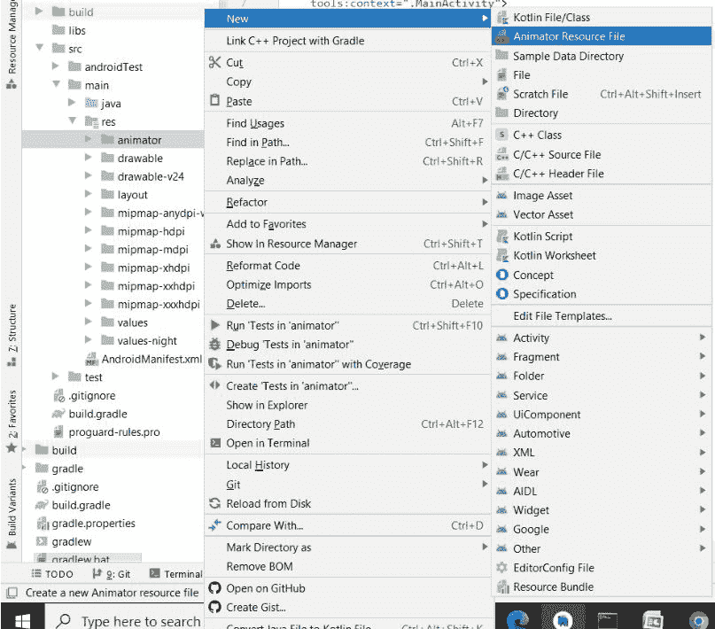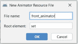 再次创建一个名为 back_animator.xml 的新动画师资源文件,该文件将处理翻转卡后部的动画。要创建一个新的动画师资源文件,请遵循前面显示的创建 front_animator.xml 文件的相同图像。
