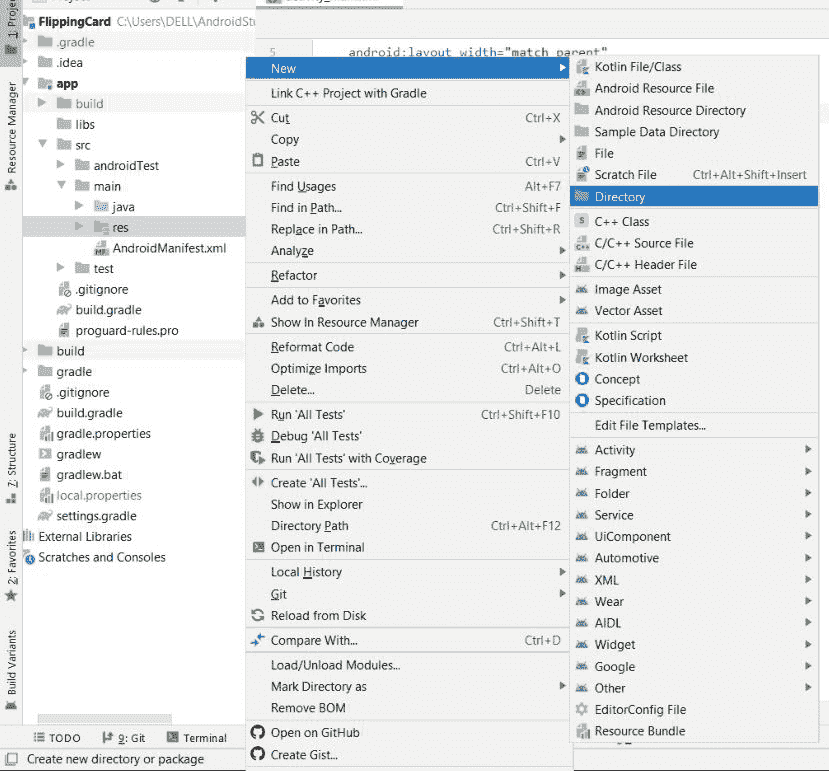 创建一个名为动画师的新目录,我们将在这里处理卡片的前后动画部分。要创建一个新目录,请遵循下面给出的图片。