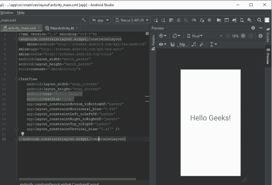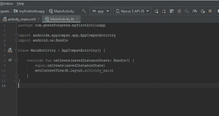MainActivity.kt–这是 Kotlin 文件,用来用 Kotlin 语言编码。activity_main.xml–这是 xml 文件,用于我们主要活动的布局。