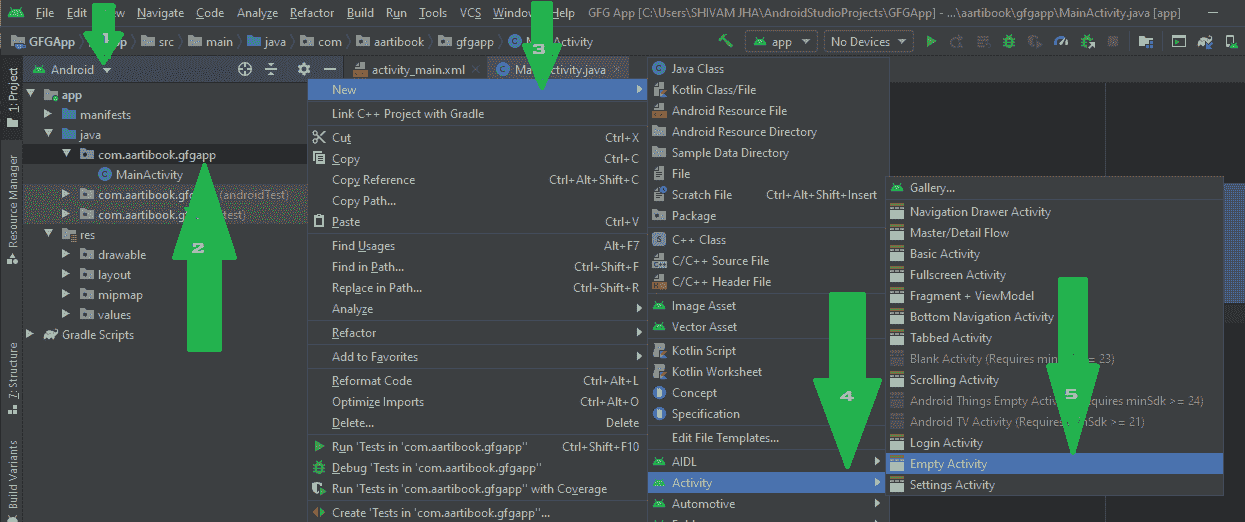 确保您已经在屏幕左上角选择了安卓作为项目结构。然后导航到 java/your_package_name 。现在,右键单击您的包名称并在此选择新建,然后选择活动和空活动。