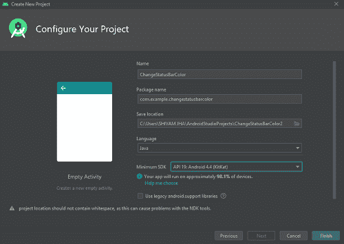 第一步:打开 Android Studio,选择一个空的活动,开始一个新的项目。给它一个你选择的名字,然后选择你的语言和应用编程接口级别。最后点击完成。