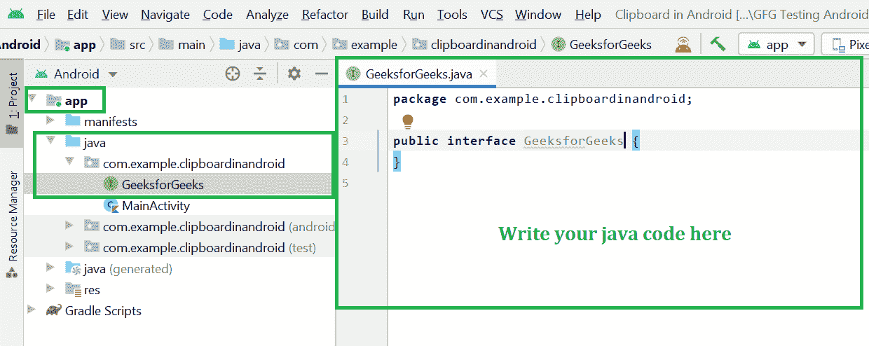 成功完成上述步骤后,您可以在这里找到您的 Java 接口。前往 app > java >您的套餐名称>GeeksforGeeks.java。你可以在这里编写自己的 Java 代码。
