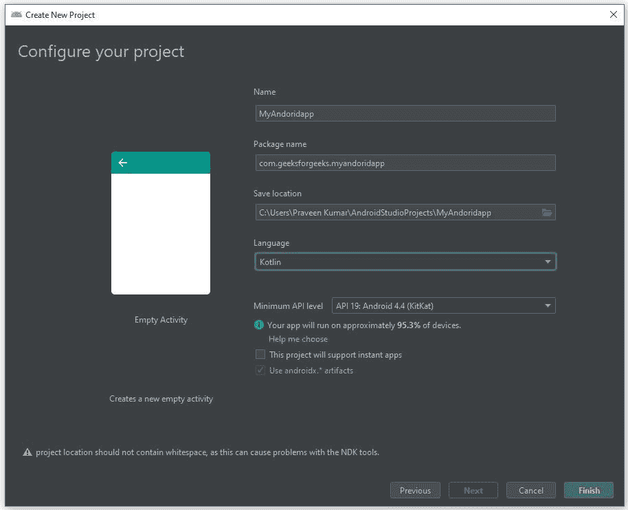第 3 步:这里我们写下应用程序的名称,并为项目选择语言科特林。然后,点击完成按钮启动项目。