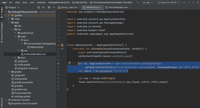 第 7 步:转到 MainActivity.kt,输入下面的代码,从 AndroidManifest.xml 中的元数据中获取 KEY 值