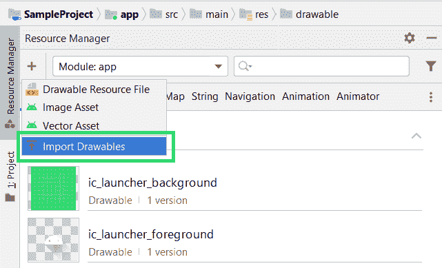 添加安卓工作室可绘制资源以外的图像文件: 点击最左侧面板的“资源管理器”选项卡,选择“导入可绘制资源”选项。