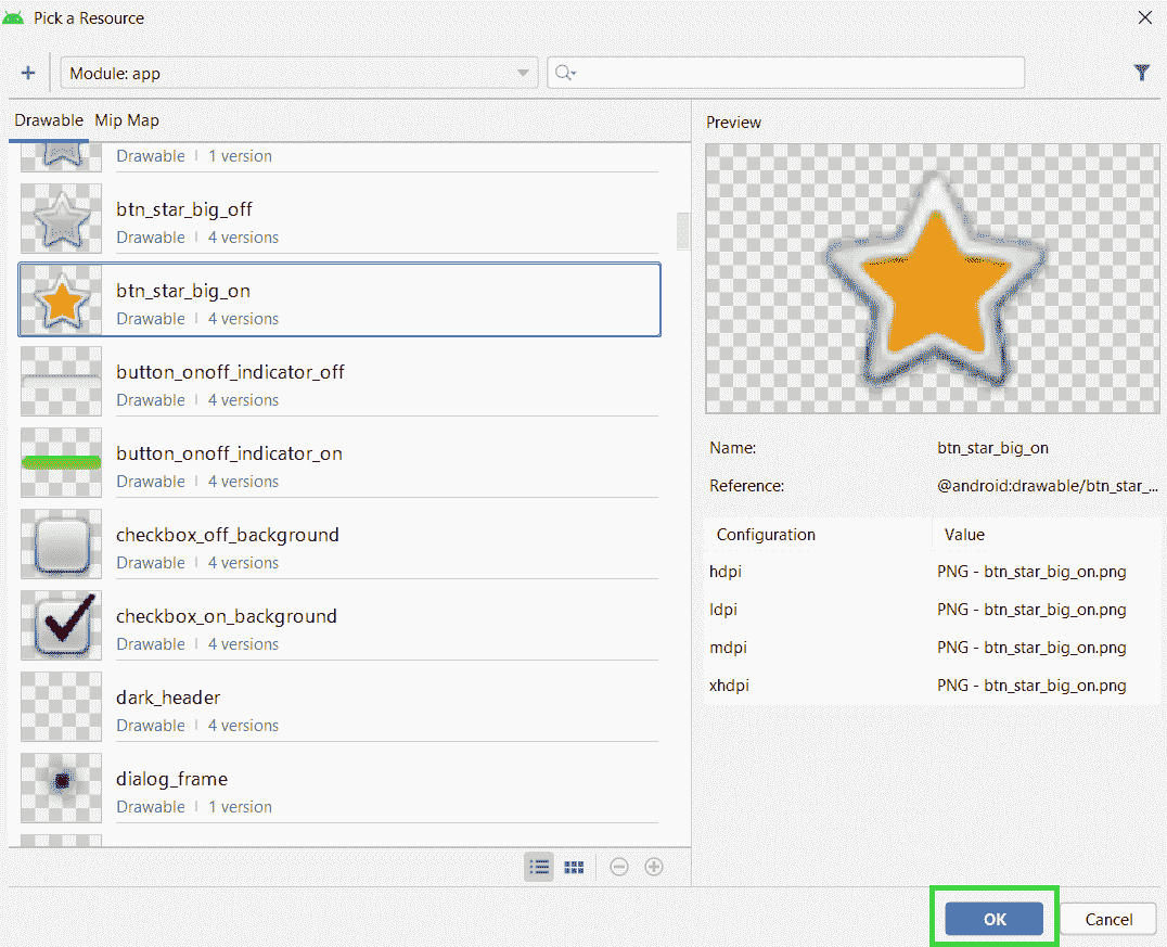 从 Android Studio 添加图像将 ImageView 小部件拖动到应用程序的活动区域,将打开一个弹出对话框,从广泛的可绘制资源中进行选择,然后单击“确定”。