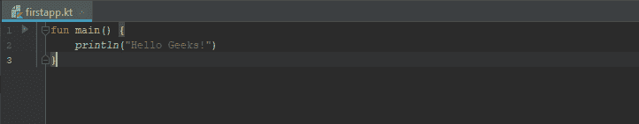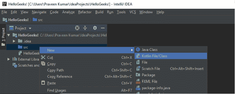 Now you have new project HelloGeeks!. Create a new Kotlin file under the source(src) folder and let’s name it is firstapp.kt