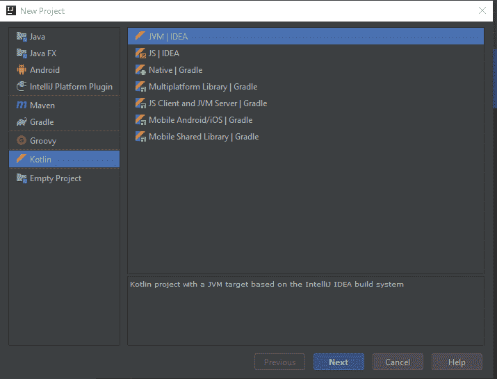 Once you have installed the Intellij IDEA, create a Kotlin application. Creating a new project from File -> New -> Project.Then select Kotlin -> JVM | IDEA .