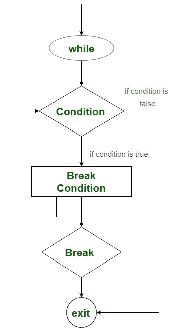当循环满足特定条件而不检查测试表达式时,使用无标记断点退出循环。然后,将控制转移到 while 块的以下语句。 while 循环的中断语法–