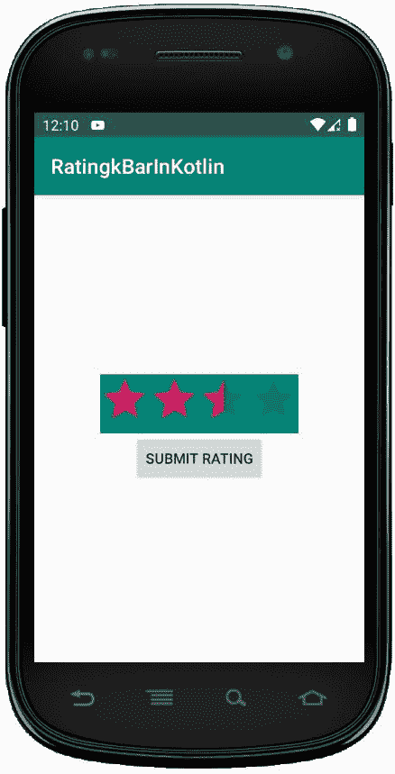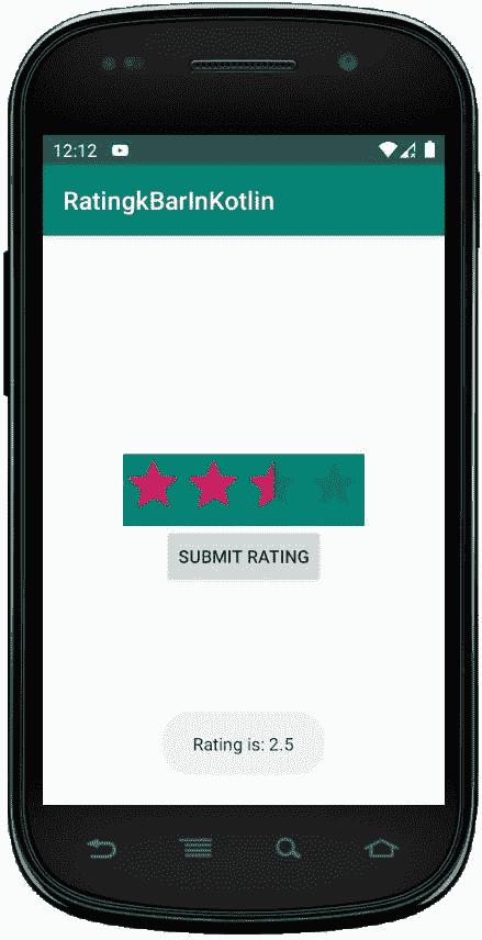 在 RatingBar 中,我们可以使用 android:stepSize 设置步长,它总是会返回一个 1.0、2.0、2.5 等浮点数形式的评级值。通过使用,安卓:numStars 属性,我们可以在 RatingBar 中指定星星的数量。RatingBar 用于从用户或客户那里获得关于产品、电影或酒店体验等的评级。