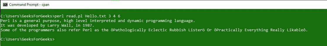 **Filename.pl****File_to_be_read.abc****x y z**这里, Filename.pl 是包含 perl 脚本 File _ to _ be _ read . ABC是要读取的文件的名称。该文件可以是任何类型。文字、脚本等。 x y z 是要打印的行号。