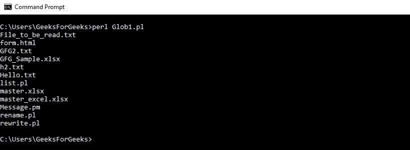 @files = glob('C:/Users/GeeksForGeeks/Folder/*'); foreach \(file (@files) # Loop to run through all files { print basename(\)file), "\n"; # Print all files } ```