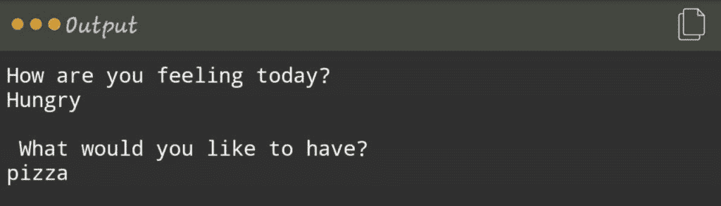 print "How are you feeling today?\n"; my \(stmt = <>; print(\)stmt); if ($stmt == /hungry/) { print "\nWhat would you like to have?\n"; my \(ip = <>; print(\)ip); } ```