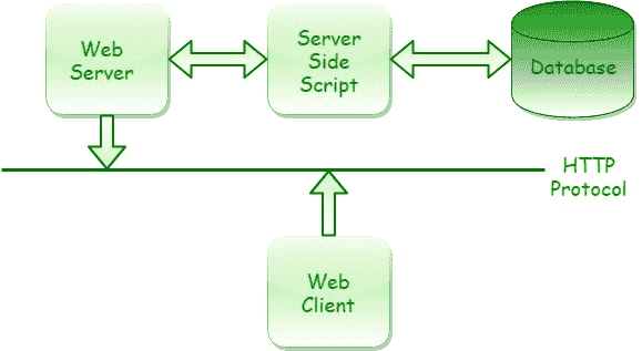 上图中,在客户端机器上运行的 HTTP(超文本传输协议)网络浏览器的帮助下,与网络服务器交换信息。由于 CGI 程序和 web 服务器通常运行在 web 服务器所在的同一系统上,因此根据浏览器的请求,web 服务器要么从自己的文档目录中提供文档,要么执行 CGI 程序。