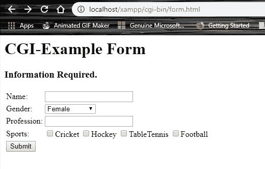 注意:HTML 表单中的每个输入元素都有一个名称属性,这在我们需要访问数据时非常重要。并且,所有的输入元素都在<表单>标签中。除此之外,<表单>标签中还有一个“动作”属性,它决定了提交表单时将调用的 CGI 脚本。