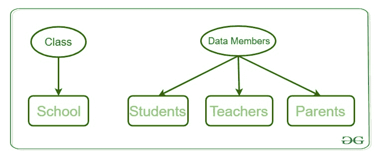 例: 考虑学校的一个班。可能有不同名称和结构的学校,但它们都有一些共同的特征,如学生、教师、员工等。所以这里的学校是以老师、学生、家长为数据成员的班级,成员函数可以是 calculate_students_marks(),calculate_teachers_salary(),和 Parents_Database()。