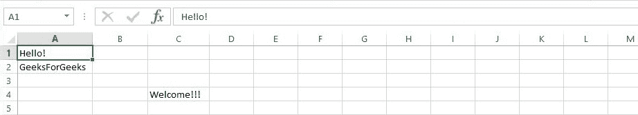 $Excelsheet->write( "A2", "GeeksForGeeks" );