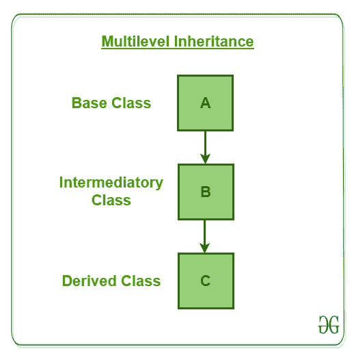 基类用于派生额外的继承子类,称为派生类。一个基类可以有多个派生类,这种类型的继承称为层次继承。这些派生类共享一个父类或基类。如果一个派生类共享多个父类并从多个父类继承其特性,那么这种继承被称为多重继承。