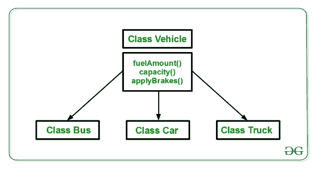 可以清楚地看到,上述过程导致同一代码重复 3 次。这增加了出错和数据冗余的机会。为了避免这种情况,使用了继承。如果我们创建一个 vehicle 类,并在其中写入这三个函数,然后从 Vehicle 类继承其余的类,那么我们就可以简单地避免数据的重复,并增加可重用性。请看下图,其中三个类继承自车辆类: