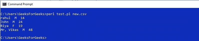 为了处理这种情况,一些限制和作用域被添加到 Perl 中,这些限制允许编译器跳过引号内的字段划分。 我们使用文本::CSV ,它允许完整的 CSV 阅读器和编写器。TEXT::CSV 是 Perl 中 MCPAN 的一个模块,它允许许多新的功能,例如读取、解析和写入 CSV 文件。这些模块可以包含在 Perl 程序中,使用以下 pragma:
