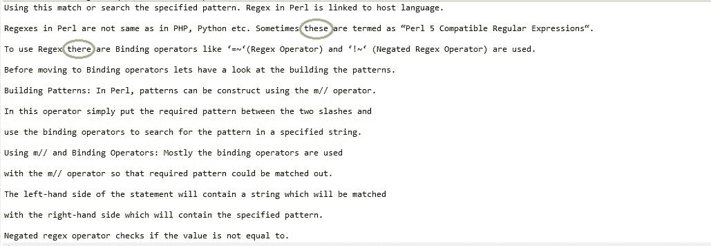 Regex 操作符有助于在文件中搜索特定的单词或一组单词。这可以根据用户的要求以多种方式完成。在 Perl 中搜索遵循的标准格式是,首先以读取模式打开文件,然后逐行进一步读取文件,然后在每行中查找所需的字符串或字符串组。当找到所需的匹配时,搜索表达式后面的语句将决定下一步如何处理匹配的字符串,它可以添加到用户指定的任何其他文件中,也可以简单地打印在控制台上。
